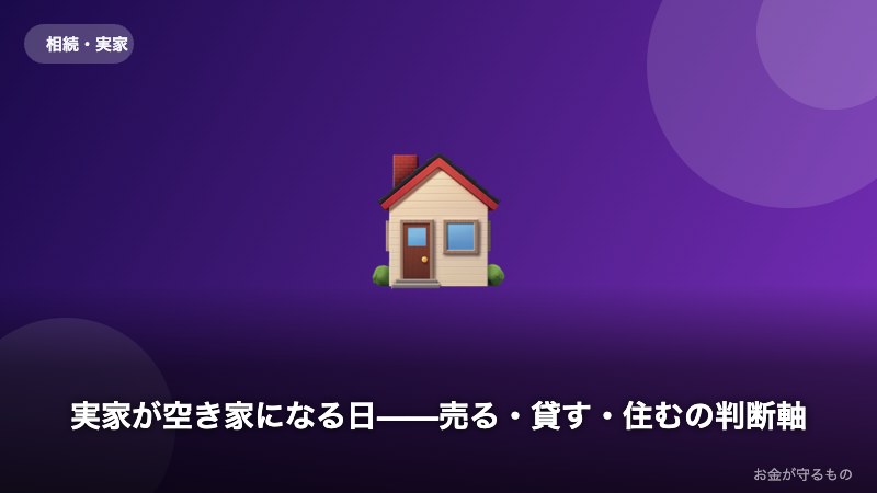 実家の空き家は、相続から1年以内に方向性を決めることを強く勧める。売る場合は税理士、貸す場合は不動産管理会社、住む場合はリフォーム見積もりを早めに取っておくこと。放置は最悪の選択肢だ。